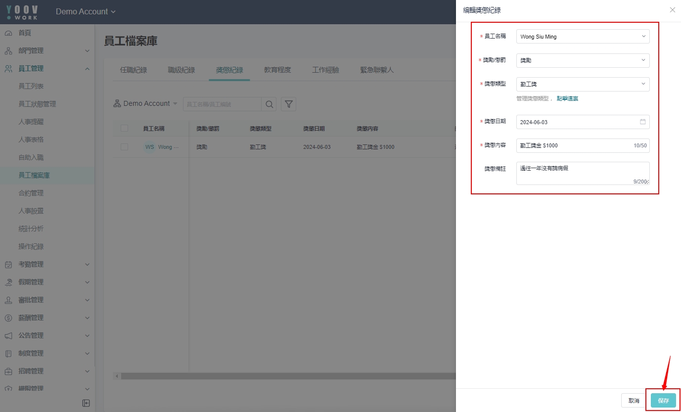 操作步骤: [员工管理]>[员工档案库]>[奖惩纪录],点选对应员工按下 「编辑」