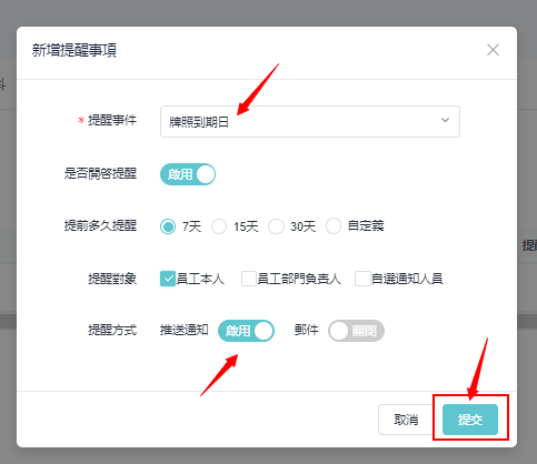 ③ 在新增提醒事项窗口，选择提醒事项，设定是否 「开启」 提醒、提醒时间、对象、方式，点选 「提交」，如下范例：\