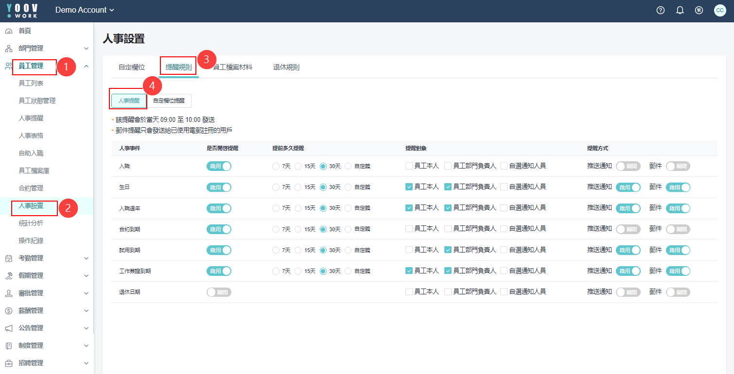 * 系统预设了常用人事提醒事件有入职、生日、入职周年、合约到期、使用到期，管理员可按需开启提醒功能，到事件设定的提醒日期时，系统将会自动发出讯息或邮件给对应的提醒对象。