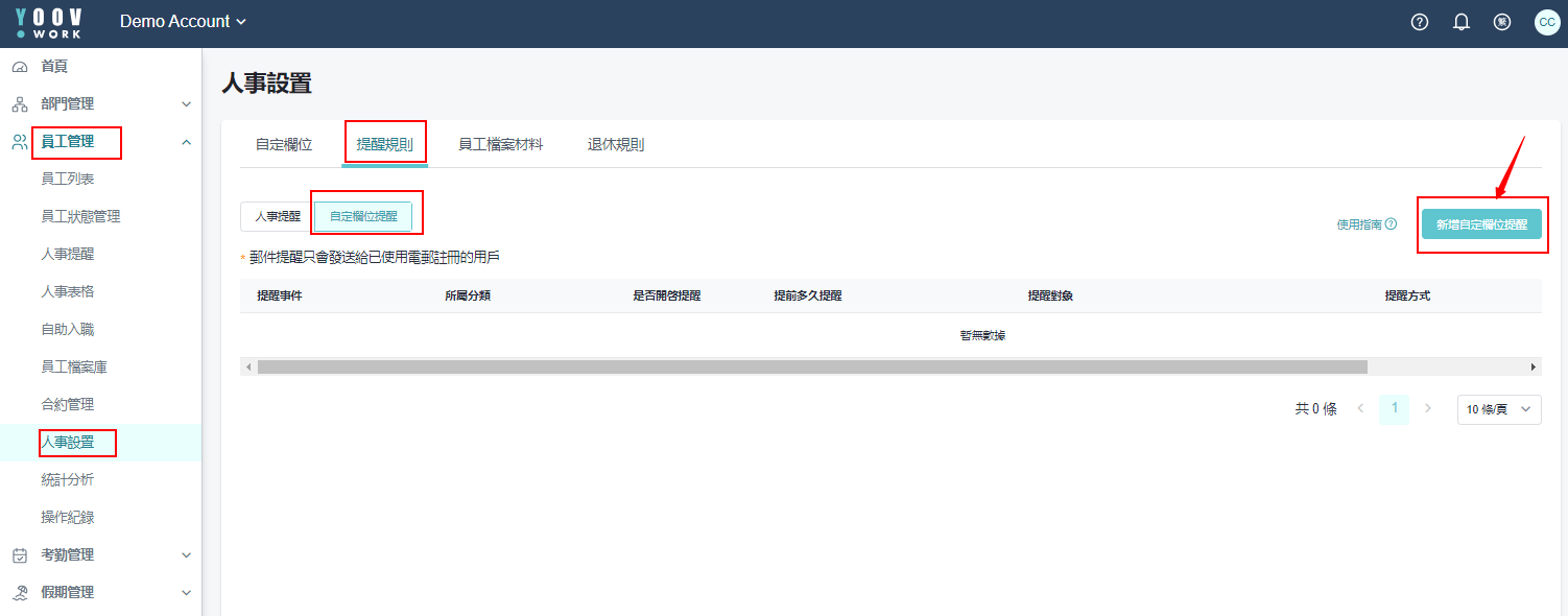 ［员工管理］>［人事设置］>［提醒规则］>［自定栏位提醒］>［新增自定栏位提醒］\