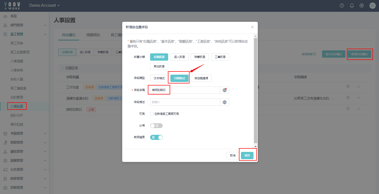 ① 首先，自定栏位提醒，是为除系统 「预设」 以外的事件作提醒。而且是为以 「日期格式」 为栏位类型的自定事件作提醒。例如下面设置。如需要，管理员可先到［员工管理］>［人事设置］>［自定栏位］>［新增自定栏位］设定事件。\