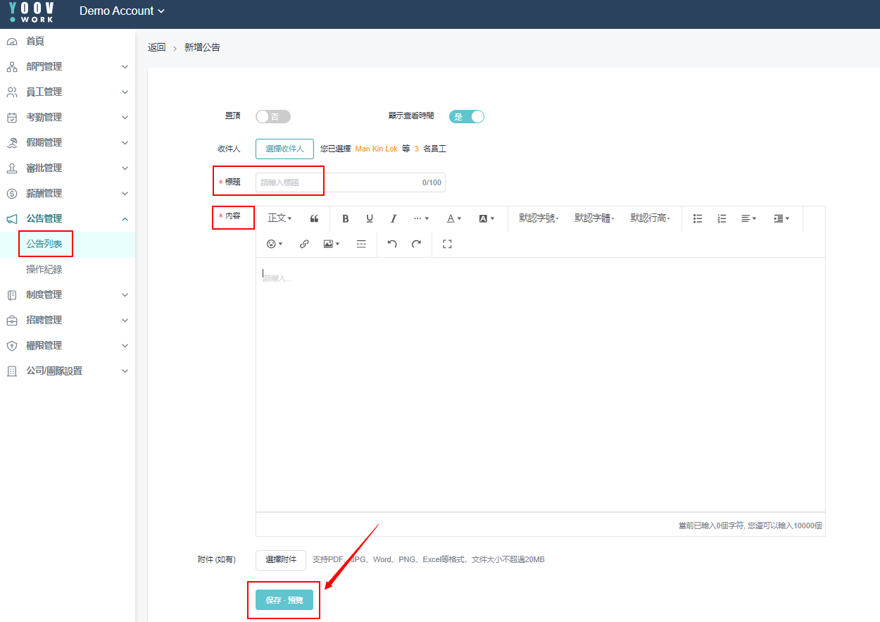 * 管理员能在系统设置一系列提醒通知，以提升公司管理效率 。 透过邮件或发送手机App通知，提醒该员工或其部门主管，做好员工关怀。