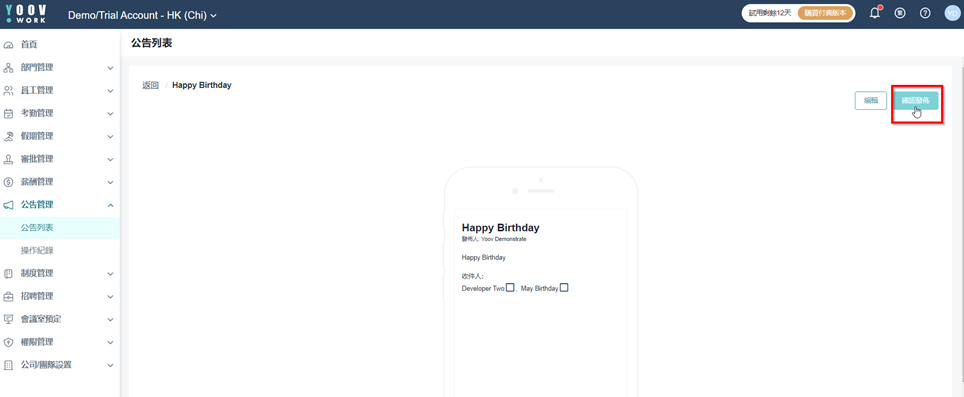3\. 预览后，再点击 「确认发布」 。发布后，员工会在手机APP的公告中或电邮收到祝福。