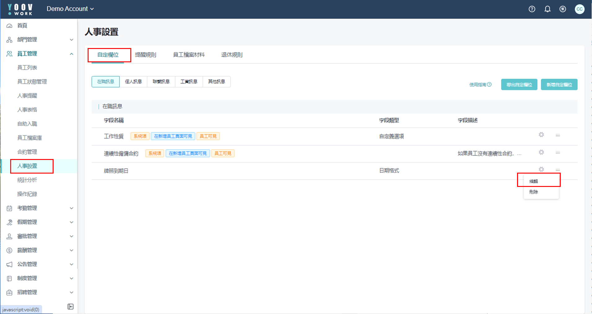 ④ 而当中的提醒事件亦能在下方人事设置的自定栏位中编辑。