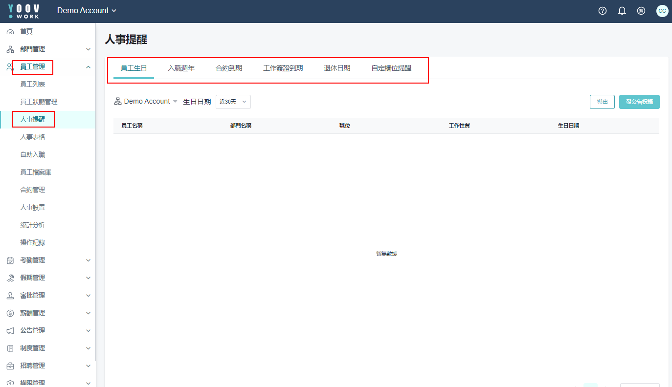 * 管理员可查看近30天、上月、当月、下个月​​、本周、今天的员工生日、入职周年、合约到期、自订栏位提醒事件