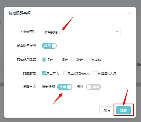 在新增提醒事项窗口,选择提醒事项,设定是否 「开启」 提醒、提醒时间、对象、方式,点选 「提交」,如下范例: