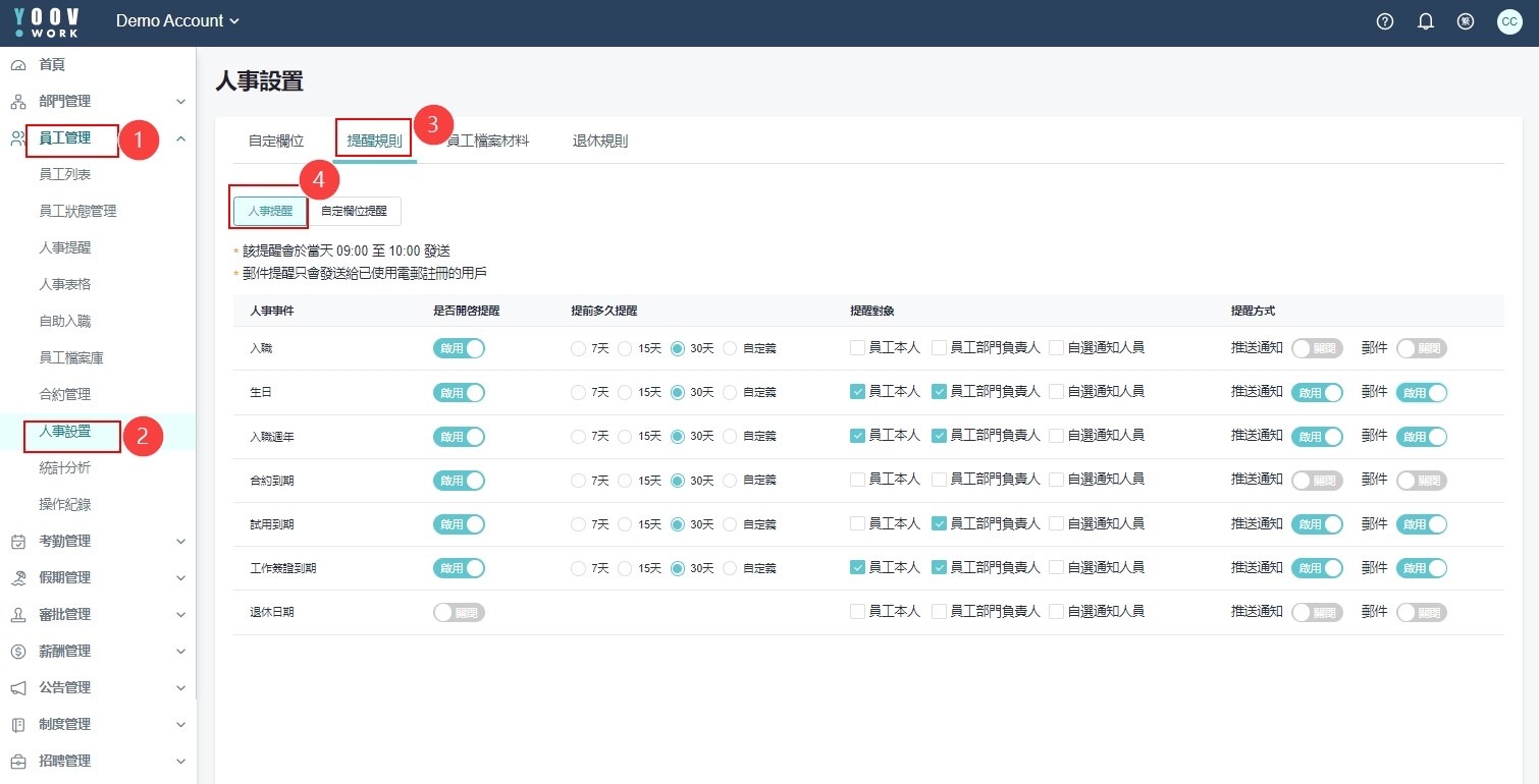 系统预设了常用人事提醒事件有入职、生日、入职周年、合约到期、使用到期,管理员可按需开启提醒功能,到事件设定的提醒日期时,系统将会自动发出讯息或邮件给对应的提醒对象。