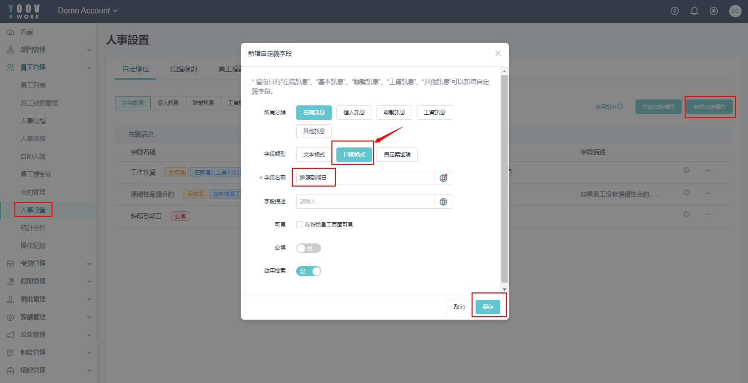 ① 首先,自定栏位提醒,是为除系统 「预设」 以外的事件作提醒。而且是为以 「日期格式」 为栏位类型的自定事件作提醒。例如下面设置。如需要,管理员可先到[员工管理]>[人事设置]>[自定栏位]>[新增自定栏位]设定事件。 ② 设定好后,可参考以下操作步骤: [员工管理]>[人事设置]>[提醒规则]>[自定栏位提醒]>[新增自定栏位提醒] ③ 在新增提醒事项窗口,选择提醒事项,设定是否 「开启」 提醒、提醒时间、对象、方式,点选 「提交」,如下范例: ④ 而当中的提醒事件亦能在下方人事设置的自定栏位中编辑。
