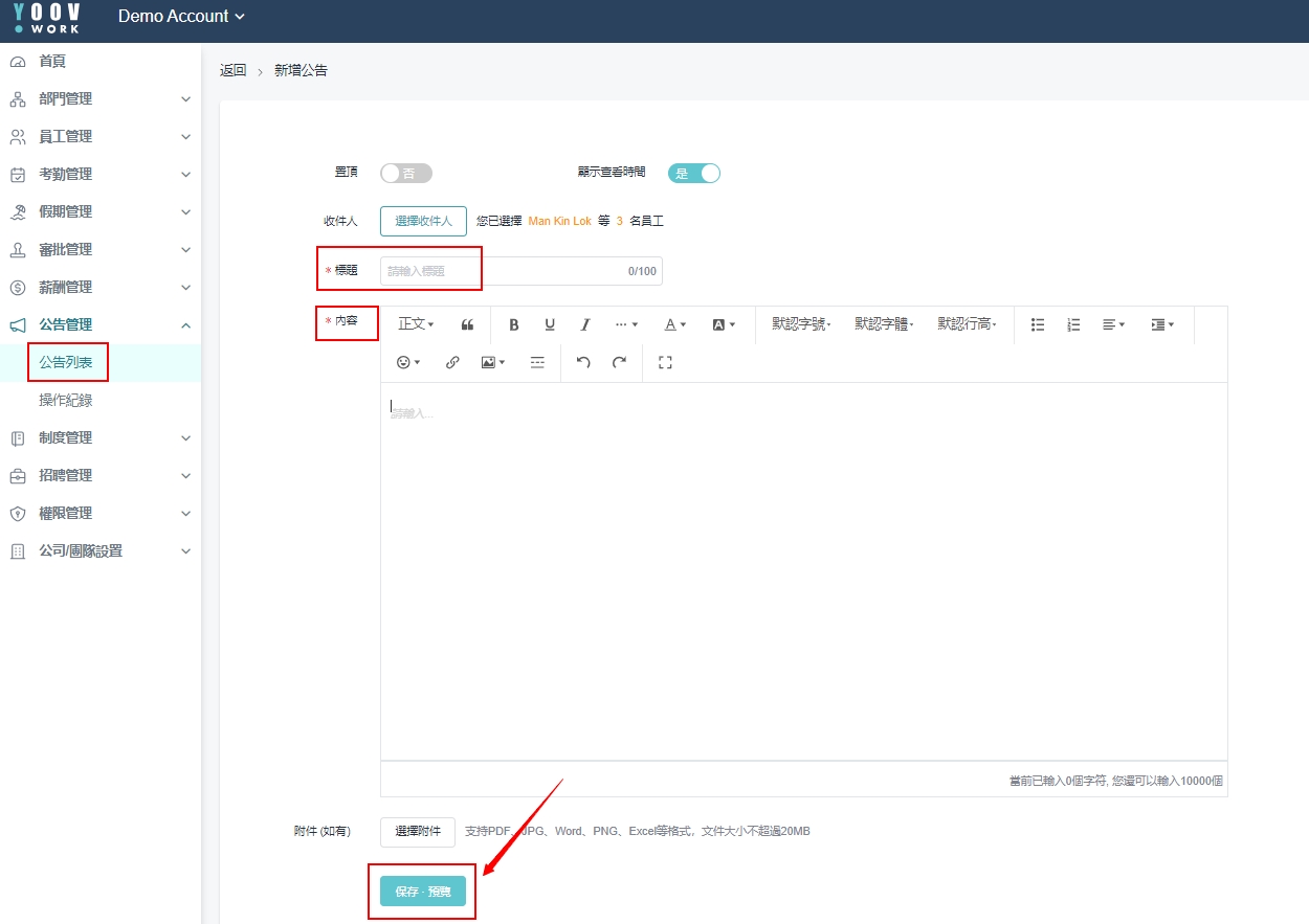 操作步骤: 1.[员工管理]>[人事提醒]>[员工生日]/[入职周年]>[发公告祝福] 2. 填写相关信息,点选「保存,预览」。 3. 预览后,再点击 「确认发布」 。发布后,员工会在手机APP的公告中或电邮收到祝福。