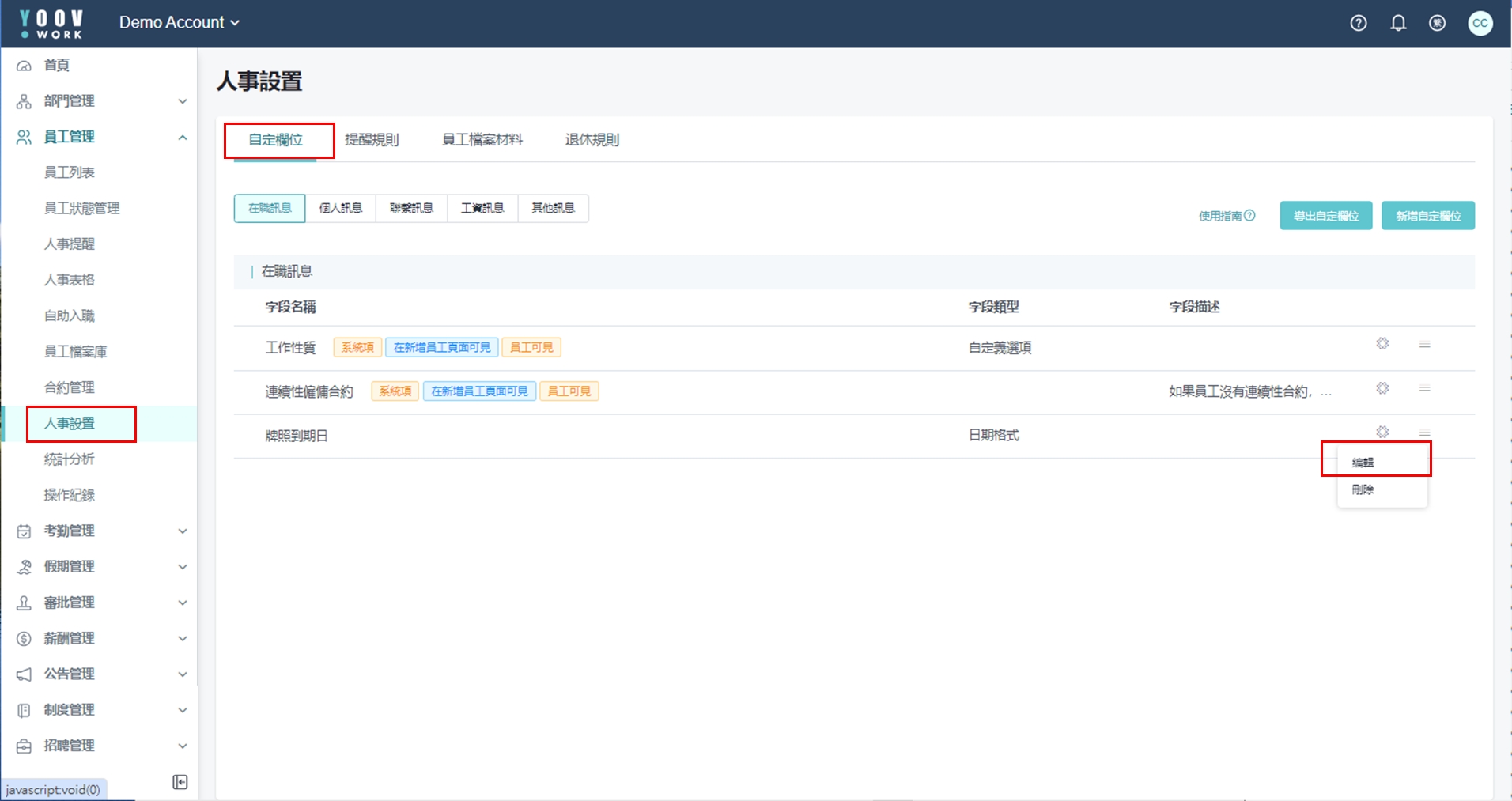 而当中的提醒事件亦能在下方人事设置的自定栏位中编辑。