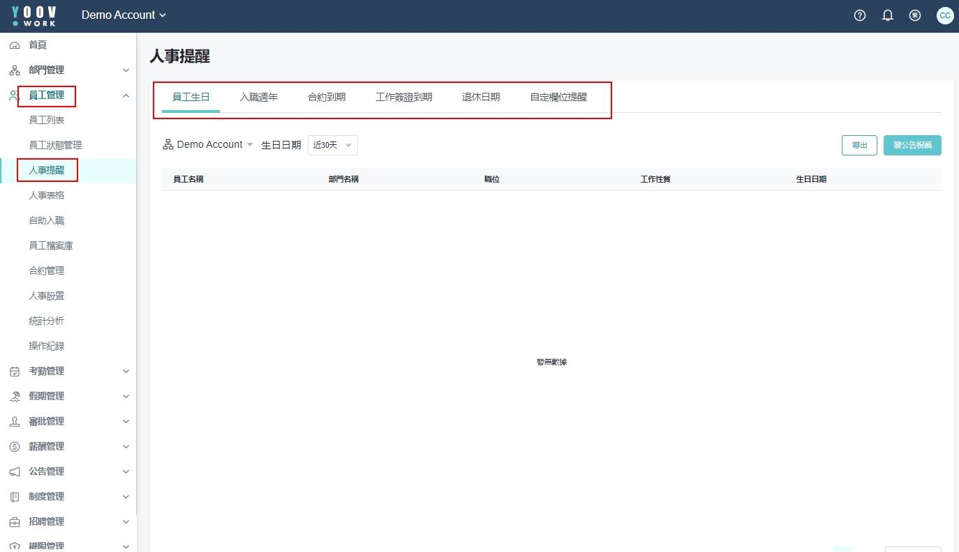 管理员可查看近30天、上月、当月、下个月、本周、今天的员工生日、入职周年、合约到期、自订栏位提醒事件