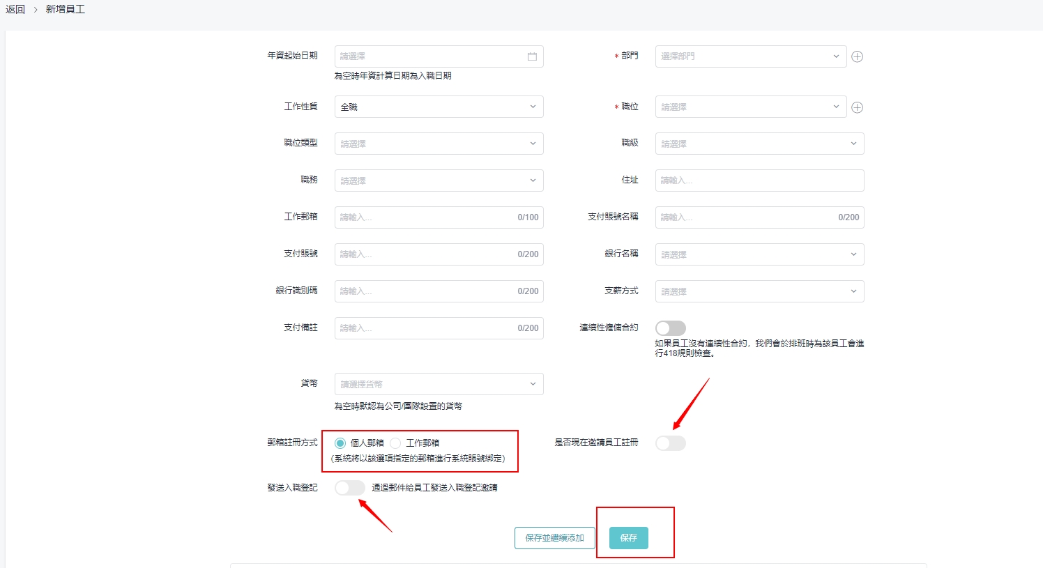 在填写资料后,管理员可选择是否现在邀请员工注册。若开启 「现在邀请」 按钮,按下 「保存」 。管理员就能透过员工登记的电邮 [发送邀请] 给该待入职员工。该 「待入职员工」 就能凭电邮邀请登记帐户,自行输入资料。