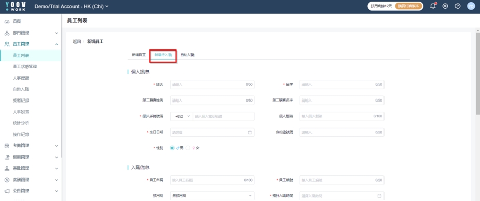 操作步骤: [员工管理]>[员工列表]>[新增员工]>[新增待入职]