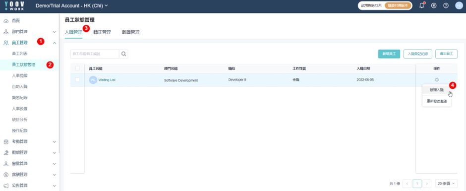 辨理入职后,员工档案可以看见入职状态转变为 「正式」 。