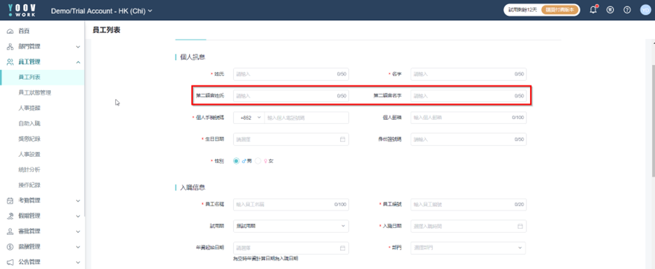 如會用到系統去生成強積金供款結算書的公司,請在第二語言姓氏和名字中填上結算書上顯示的名字。系統只會按照管理員在此輸入的資料顯示在結算書上。