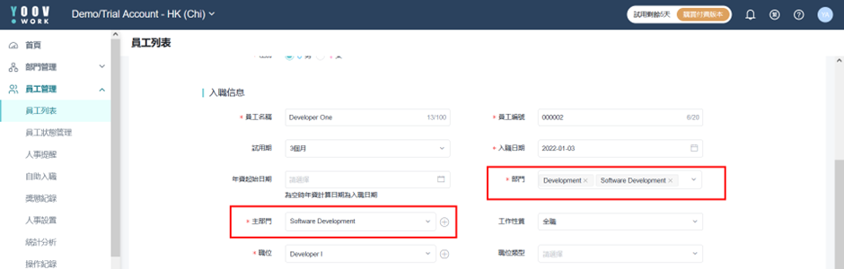 需要留意在填写部门一栏中,管理员能填写多个部门,但主部门只能填写一个并必须先填写部门。 以下图为例,员工部门为「Development」 「Software Development」,主部门就必须为这两个部门中的其中一个。所以管理员需先设定部门才可设定主部门。