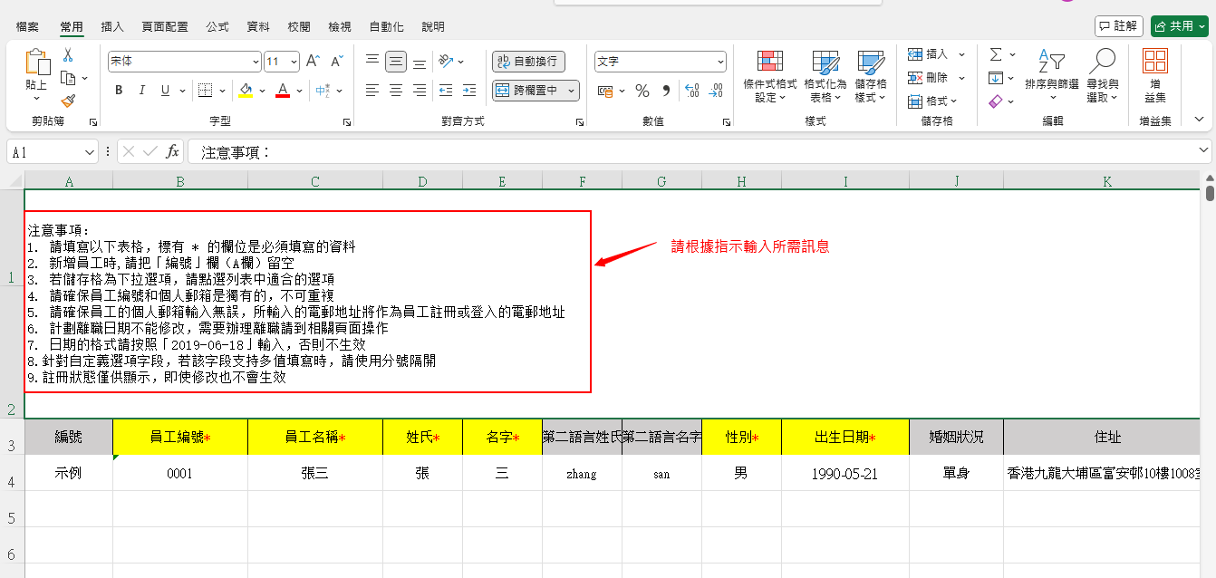 4.管理员根据Excel上的指示输入所需的讯息后,请选择 「上传附件」 上载已修改 Excel模板。如上传不成功,请参考系统提示讯息,修改该栏位,并重新上传附件。