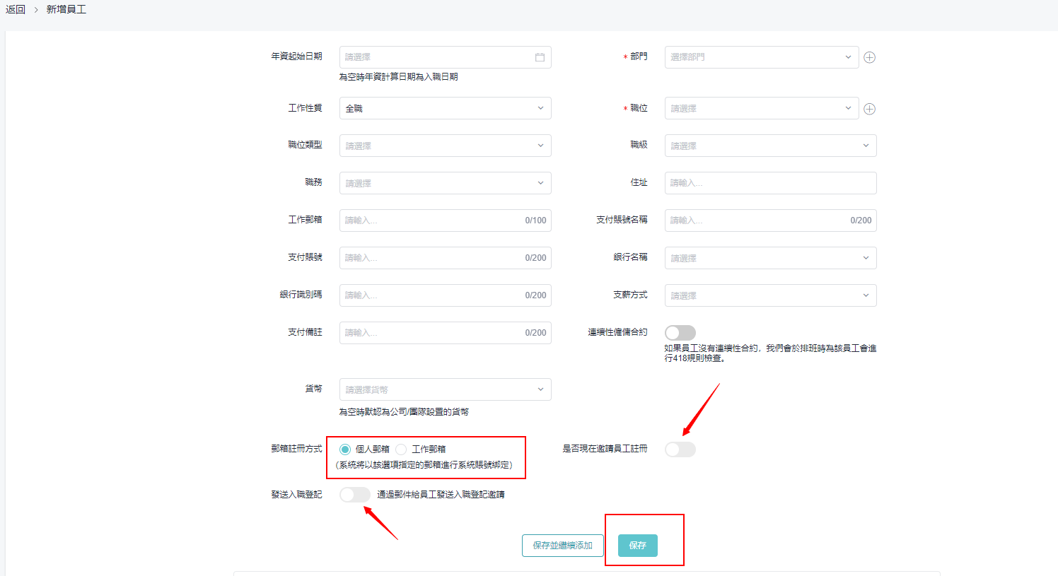选择邮箱注册方式,可以选择个人或工作邮箱,系统将以该选项指定的邮箱进行系统帐号绑定,选择后管理员可开启「是否现在邀请员工注册」,和「通过邮件给员工发送入职登记邀请」 最后点选「保存」。员工将会收到登记注册邀请。