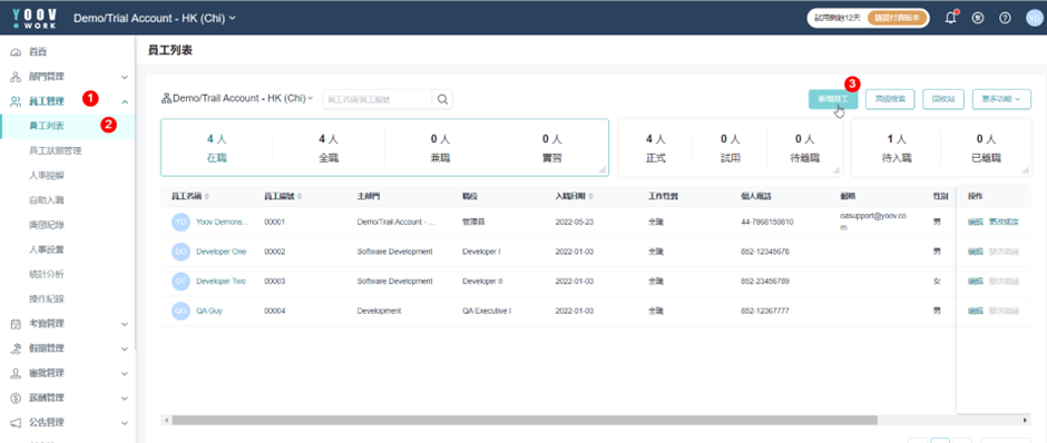 填写新员工的资料后按「保存」。 填写资料后,管理员能在「员工管理」中的「员工列表」中看到已新增员工的资料。