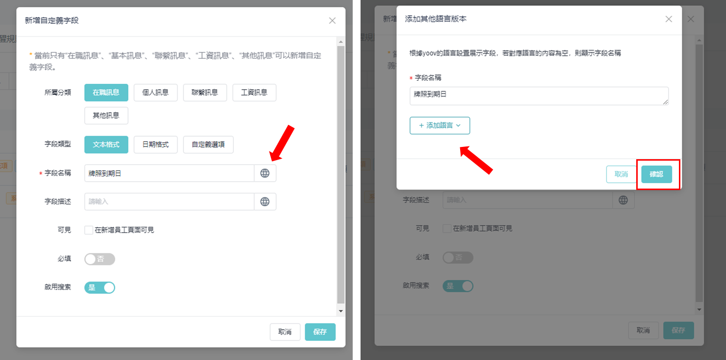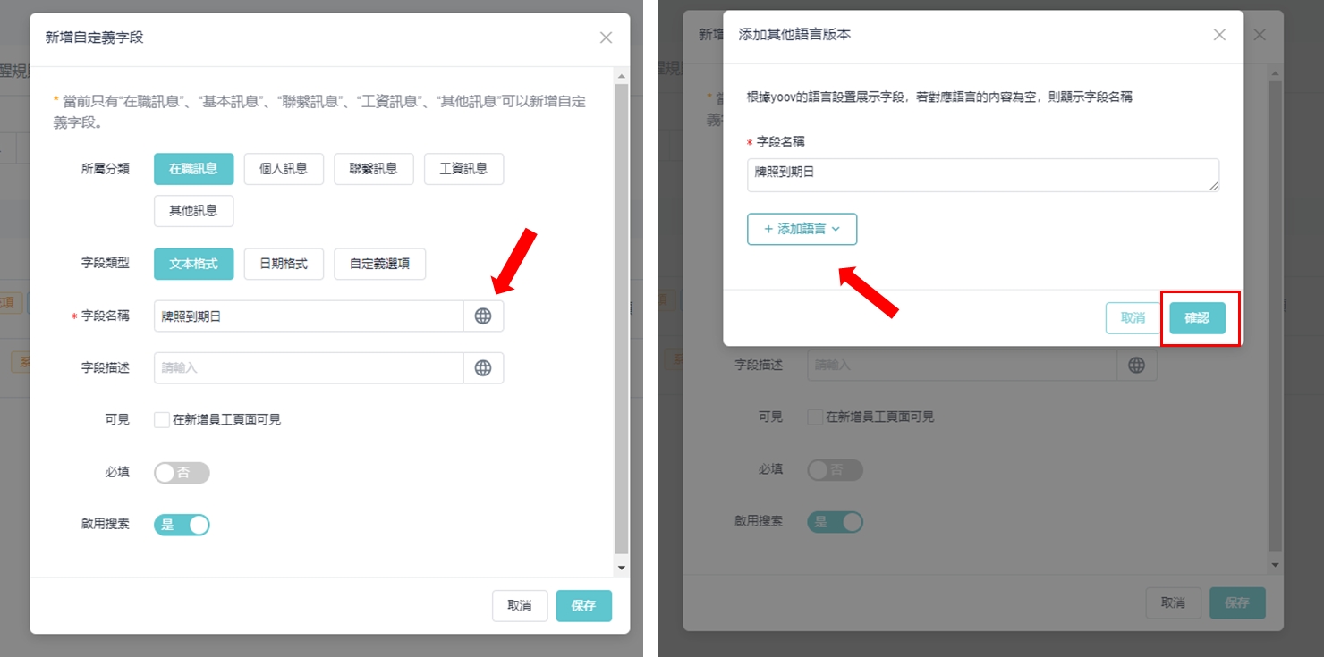 ③ 如需设置不同语言的栏位名称,可以点选右方的地球图示,然后按指示输入对应不同语言的显示名称。当输入好有关资料,会在对应的语言介面看到已设置好的名称。