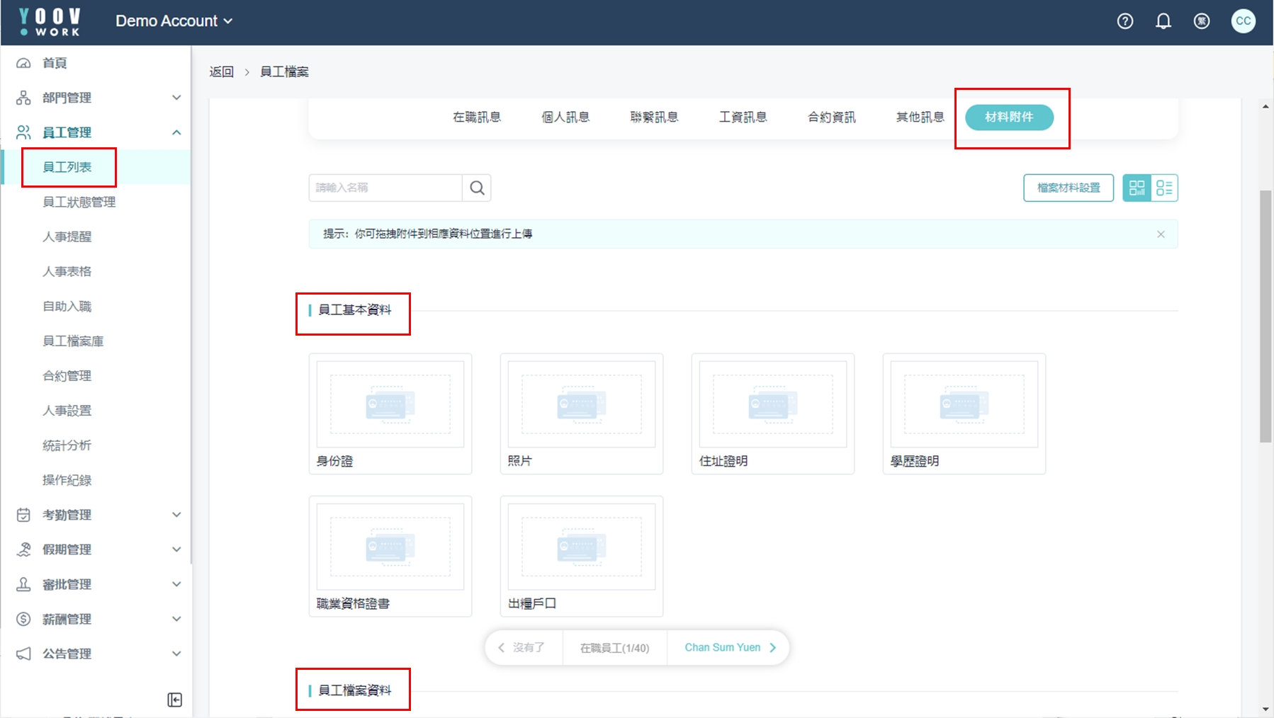 员工档案资料属于员工档案的一部分,可以在员工档案的 「附件」 中查看。