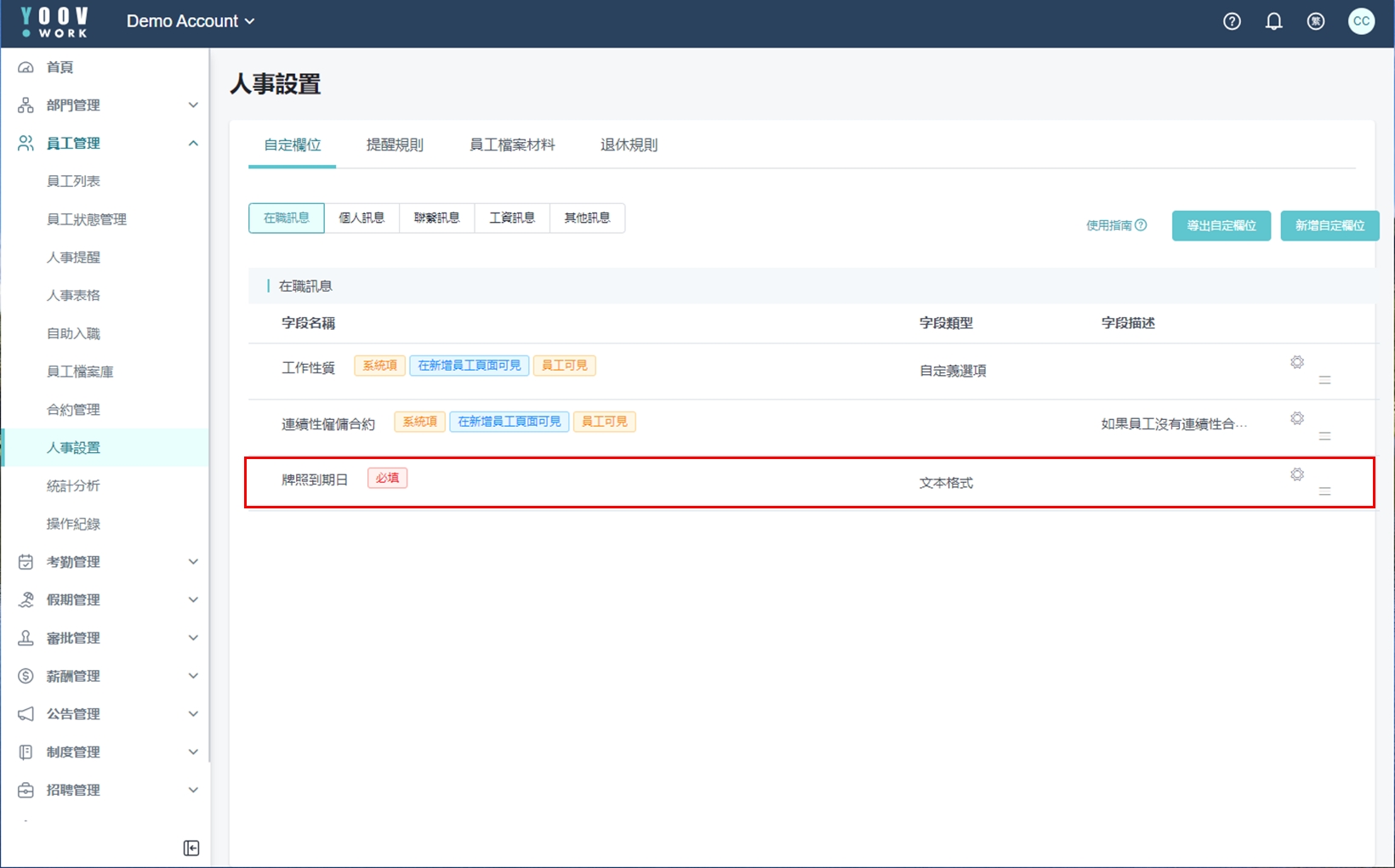 系统预设了员工档案的资讯类别,包括:在职资讯、个人资讯、联络资讯、薪资资讯、其他资讯。 管理员可以透过 「自订栏位」 功能,在这些分类下新增想要的栏位字段,即可在新增时进行员工资讯完善或办理入职登记时填写。