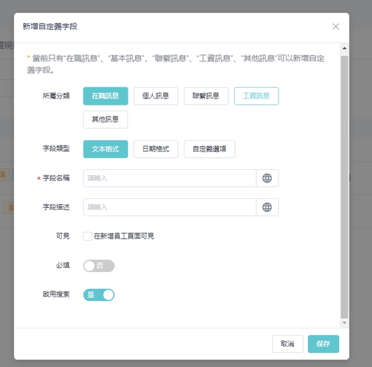 ② 在新增自订栏位窗口,输入并选择所需信息,栏位名称为必填项,新增自订栏位可在新增员工页面设定可见、是否为入职必填项等,最后点选「保存」