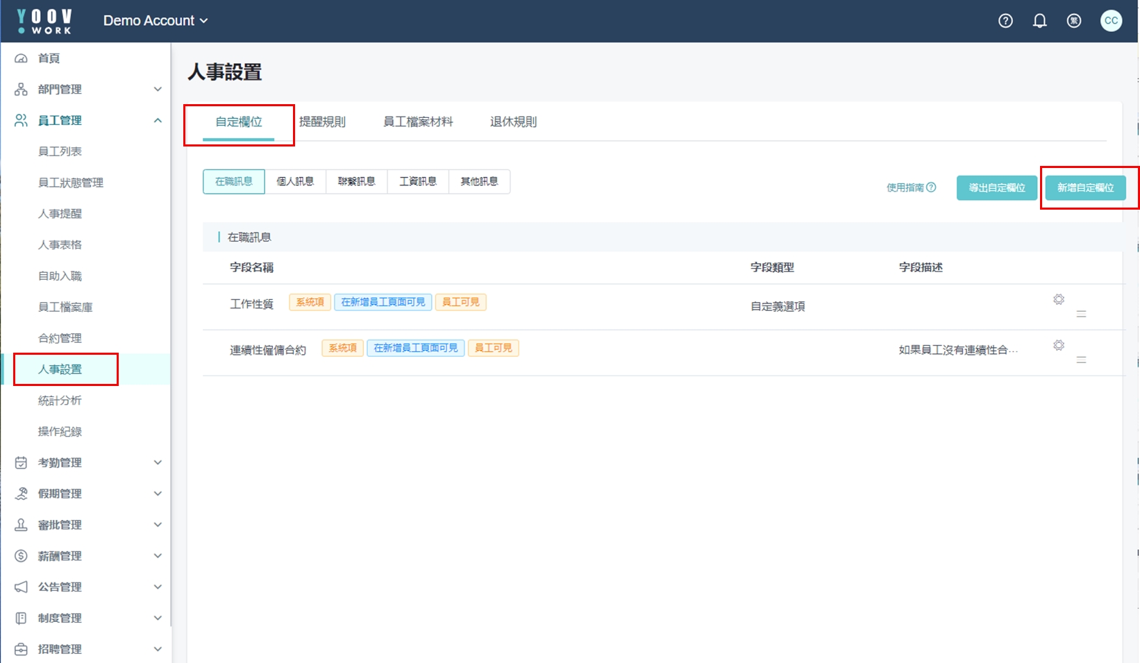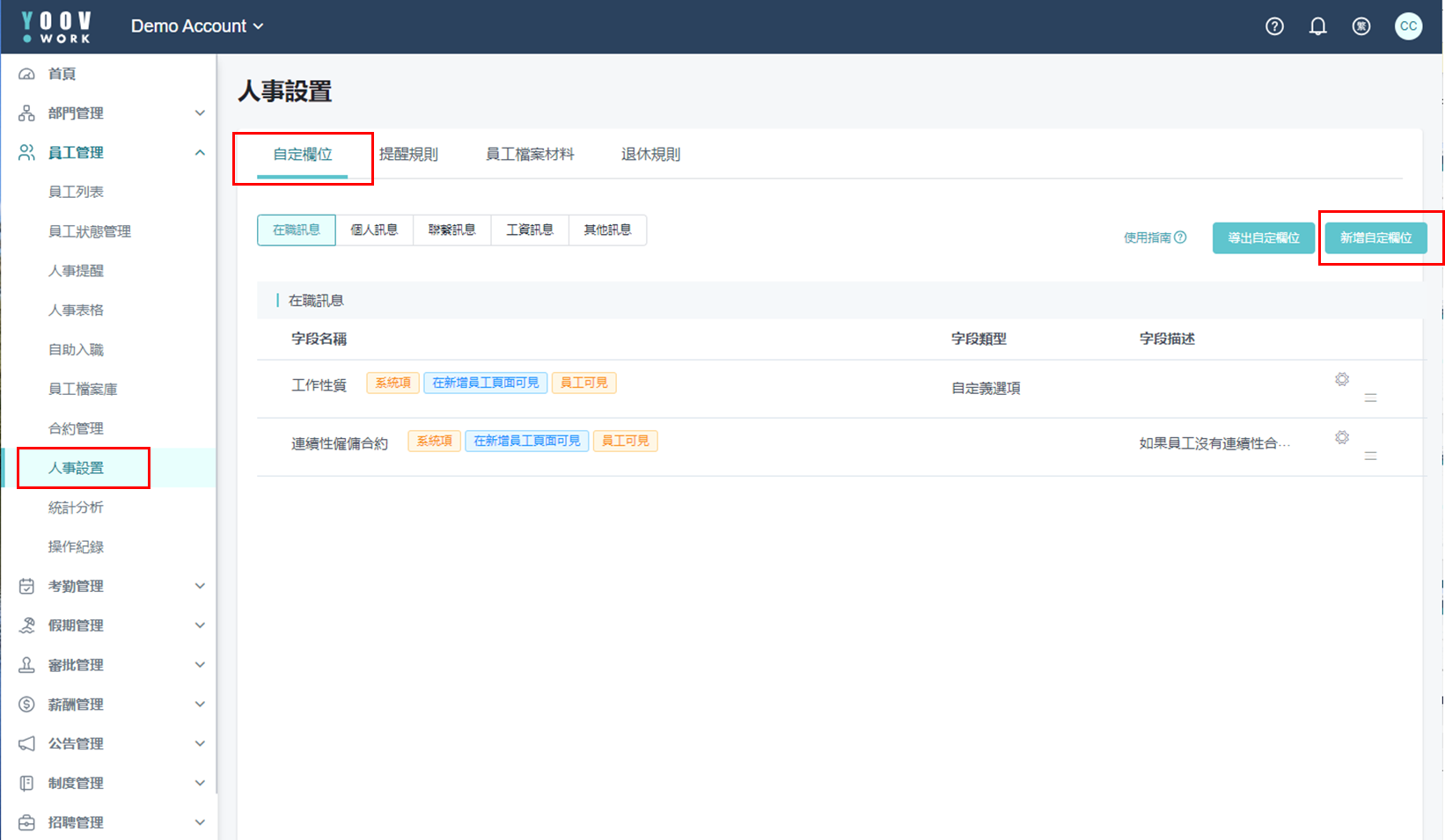 ① 操作步骤: [员工管理]>[人事设定]>[自订栏位]>[新增自订栏位]