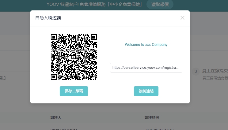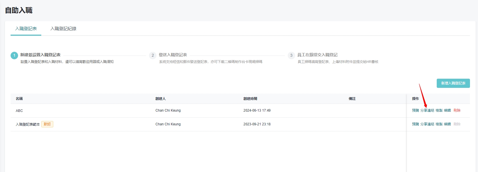 操作步骤: [员工管理]>[自助入职]>[入职登记表]>[分享连结]点选 「储存二维码」 或 「复制连结」,发给入职者