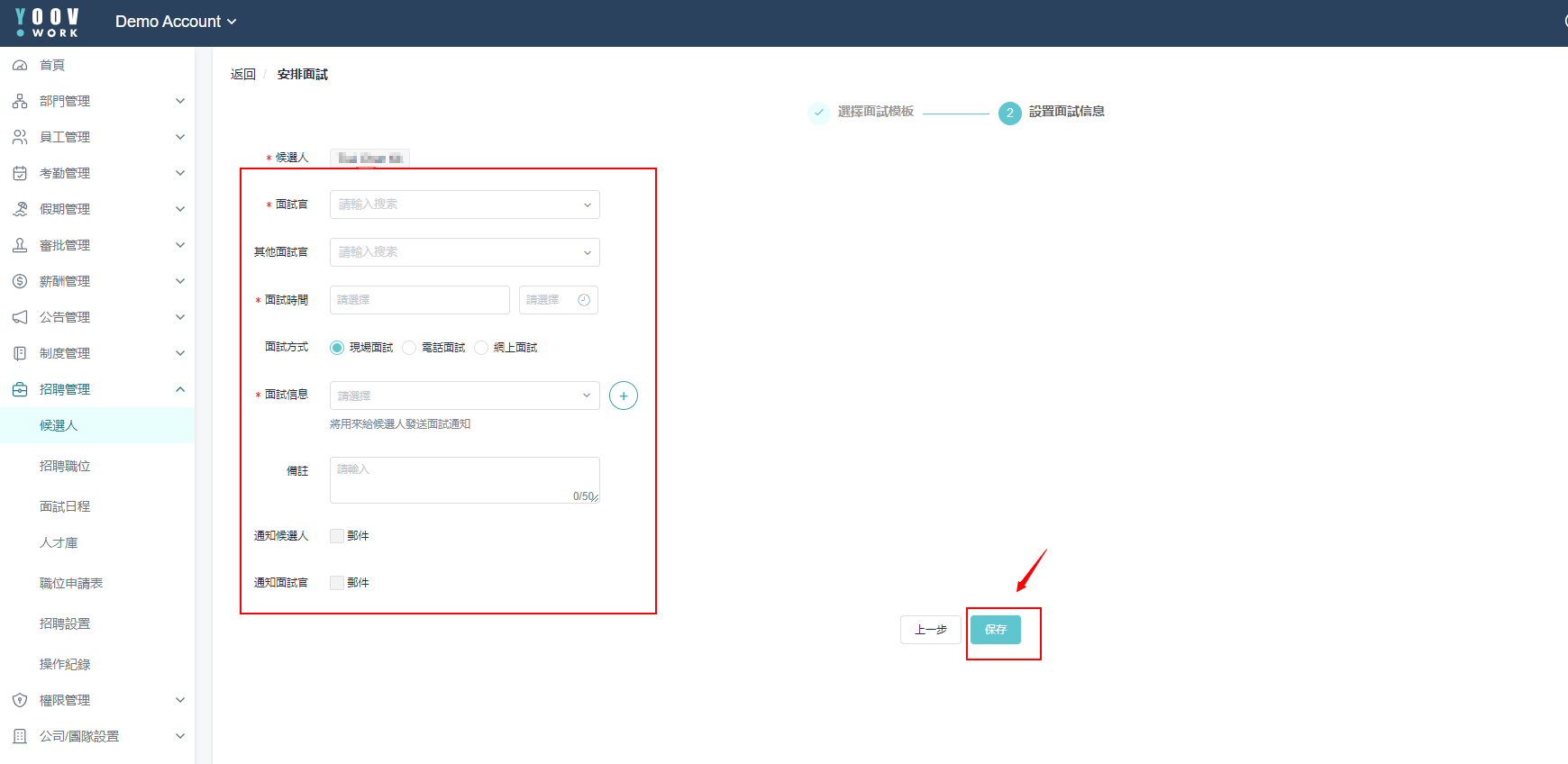 方法二:手动添加 ① 输入所需资料,然后按[保存]。 ② 输入并储存候选人资讯后,该资讯将显示在【候选人】页面的清单中。