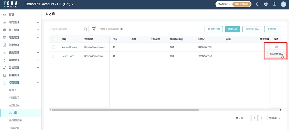 作步骤: 1.[招聘管理]>[人才库] >[新增人才] 2. 您可以选择导入履历或手动输入,请参考【新增候选人】。输入有关资料,然后按[保存]。 3. 在人才库页面中会看到刚才手动新增的候选人。 4. 管理员可将人才库中的候选人 (一个或多个) 添加到候选人列表中。 5. 之后选择要将候选人添加至哪一个职位的候选人当中,然后按[确定]。 6. 有关候选人已被新增至候选人列表中。